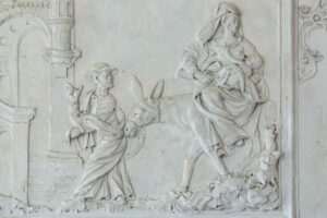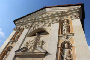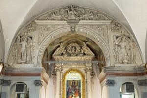 delle statue quasi a figura intera e a coppie sopra l’architrave d’imposta delle volte rappresentanti dei giovinetti che sorreggono gli angoli e che un tempo erano dipinti come dimostrano le poche tracce di colorazione rimaste.